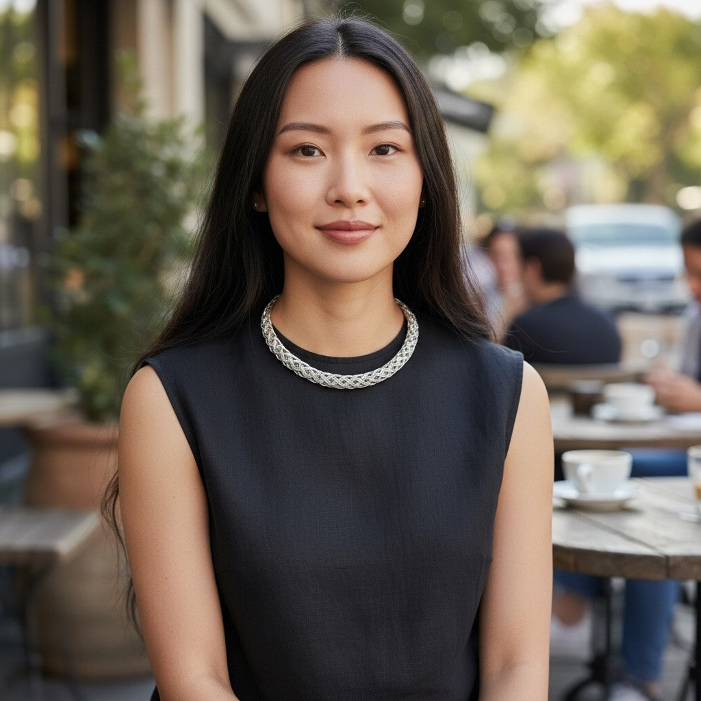 Crafted from silver tone polished, skin-friendly brass, its woven texture adds subtle drama while staying lightweight and comfortable for all‑day wear. Dress it up with a dress or layer it over a simple tee for an elevated everyday look.