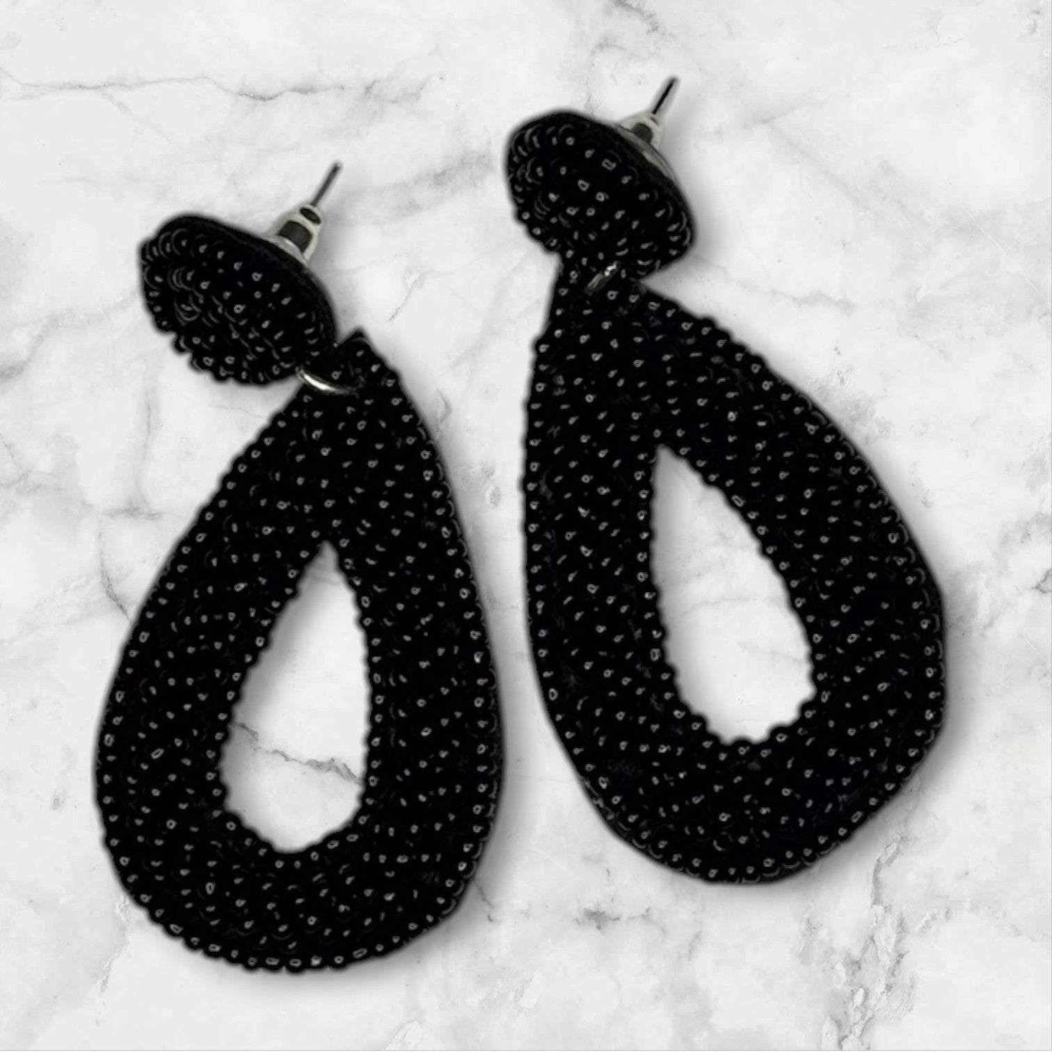 Rendered in deep black beads, they offer a sophisticated contrast that complements both minimalist and bold wardrobes. These earrings serve as a polished accessory that transitions effortlessly from professional settings to evening occasions, adding a touch of understated luxury to any appearance.