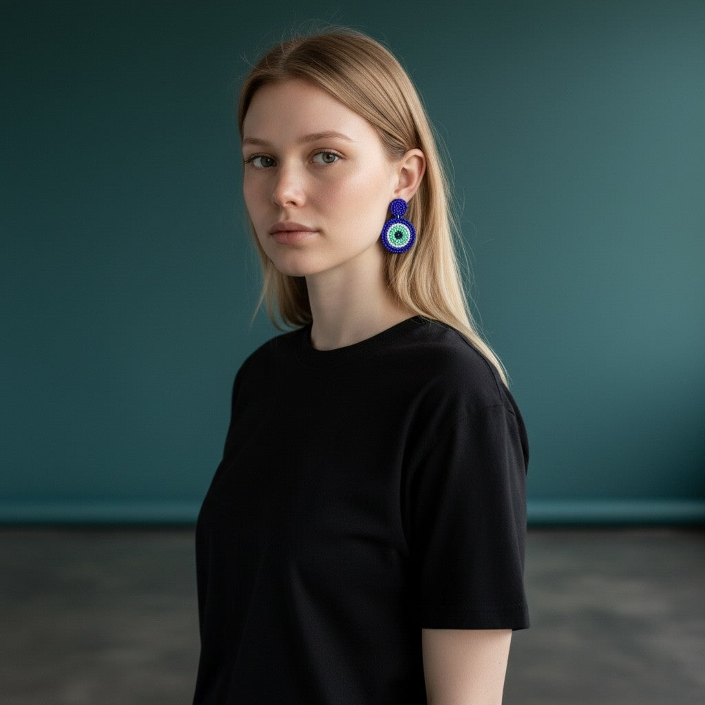 These striking blue eye beaded earrings blend mystique with refined aesthetics. Crafted in a compact size, they feature intricate beadwork that captures the mesmerizing depth of an eye in shades of blue.