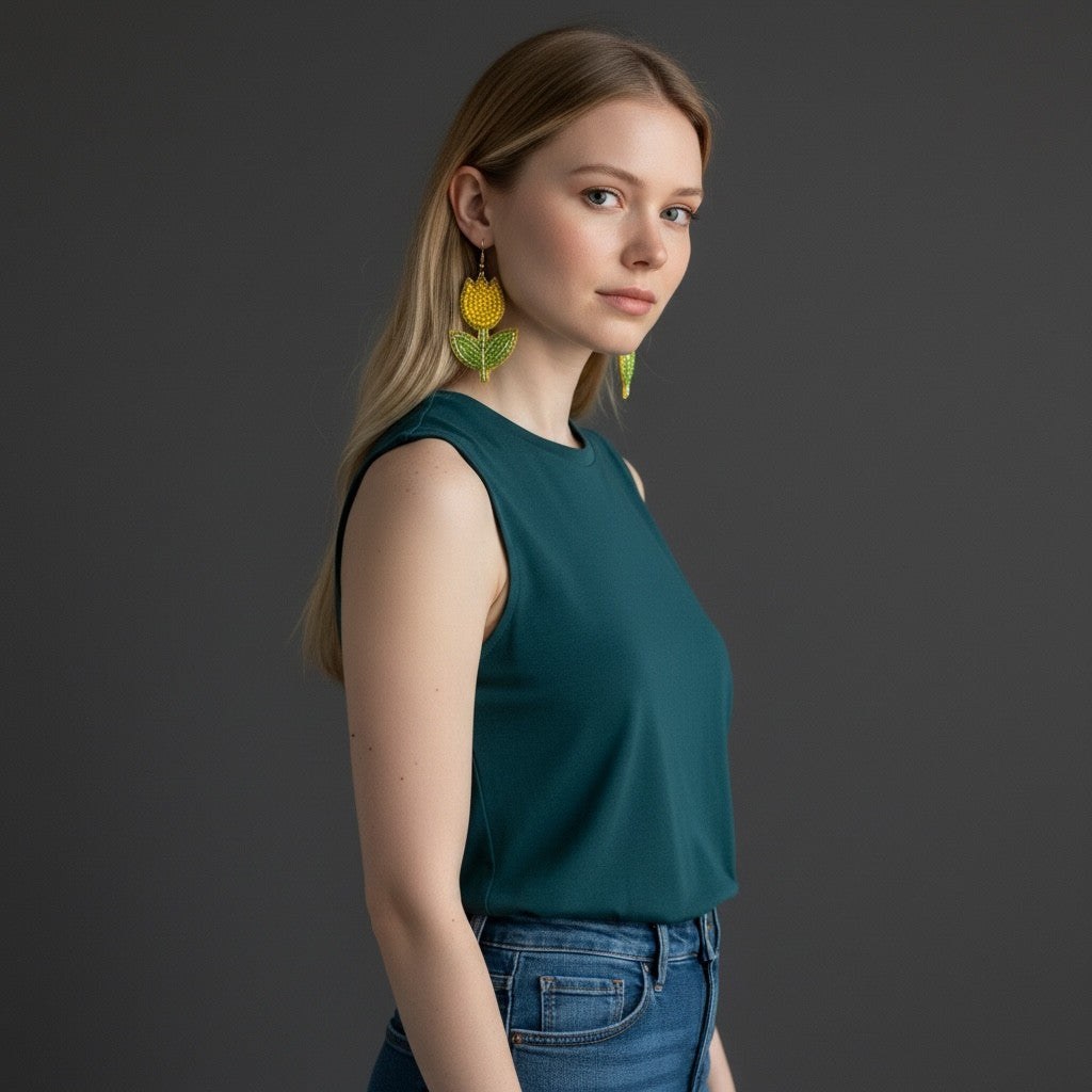 Inspired by sun-drenched tulip fields, these elegant beaded earrings capture the essence of spring's most iconic bloom. Each piece features meticulously arranged yellow beads that evoke the delicate petals of tulips in full bloom.