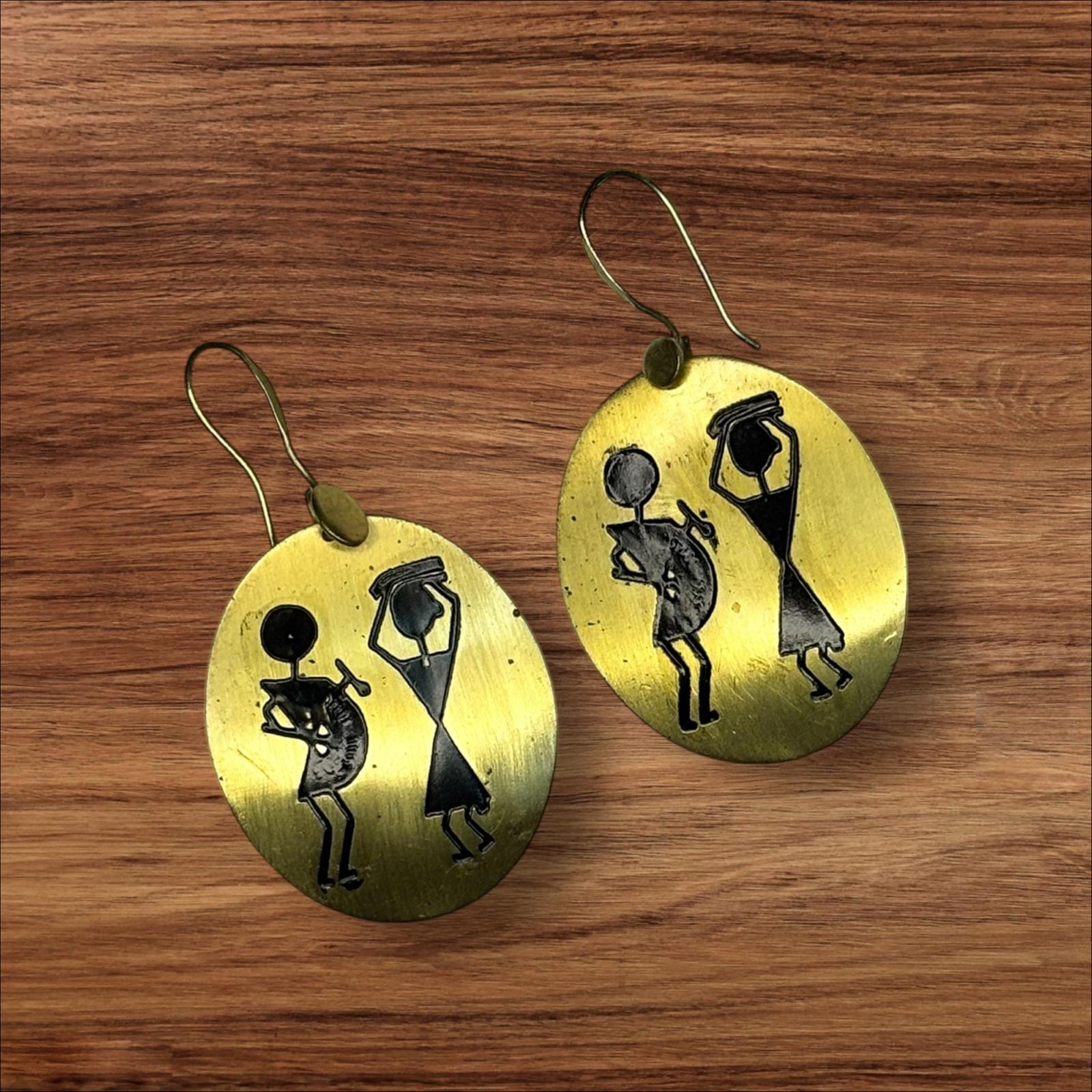 Beautifully crafted oval earrings featuring traditional Indian Warli folk art. These handcrafted pieces depict community life through elegant, blackened geometric figures on a gold-toned base.