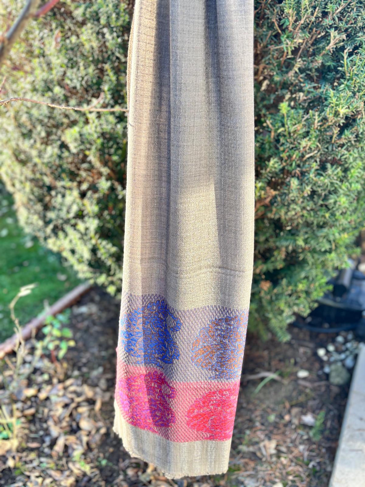 Wrap yourself in effortless elegance with our handwoven soft-weave shawl, featuring intricate jacquard patterns and vibrant floral motifs. The delicate grey-beige base is beautifully contrasted with artistic blocks of blue, purple, and pink blooms—creating a subtle yet stunning pop of colour.
