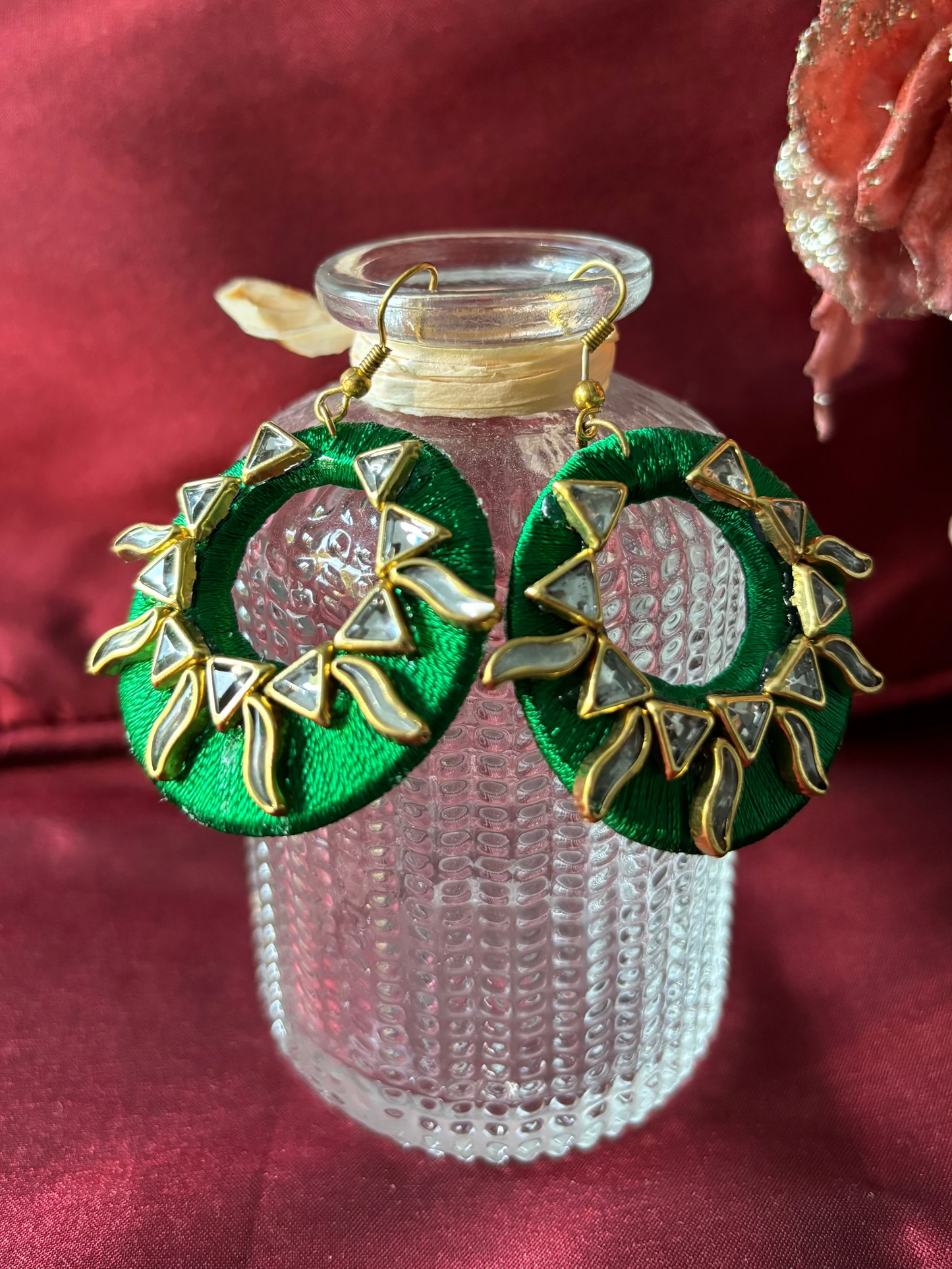 Seidenfaden-Ohrringe - Grün farbe mit goldenen Kundan-Motiven